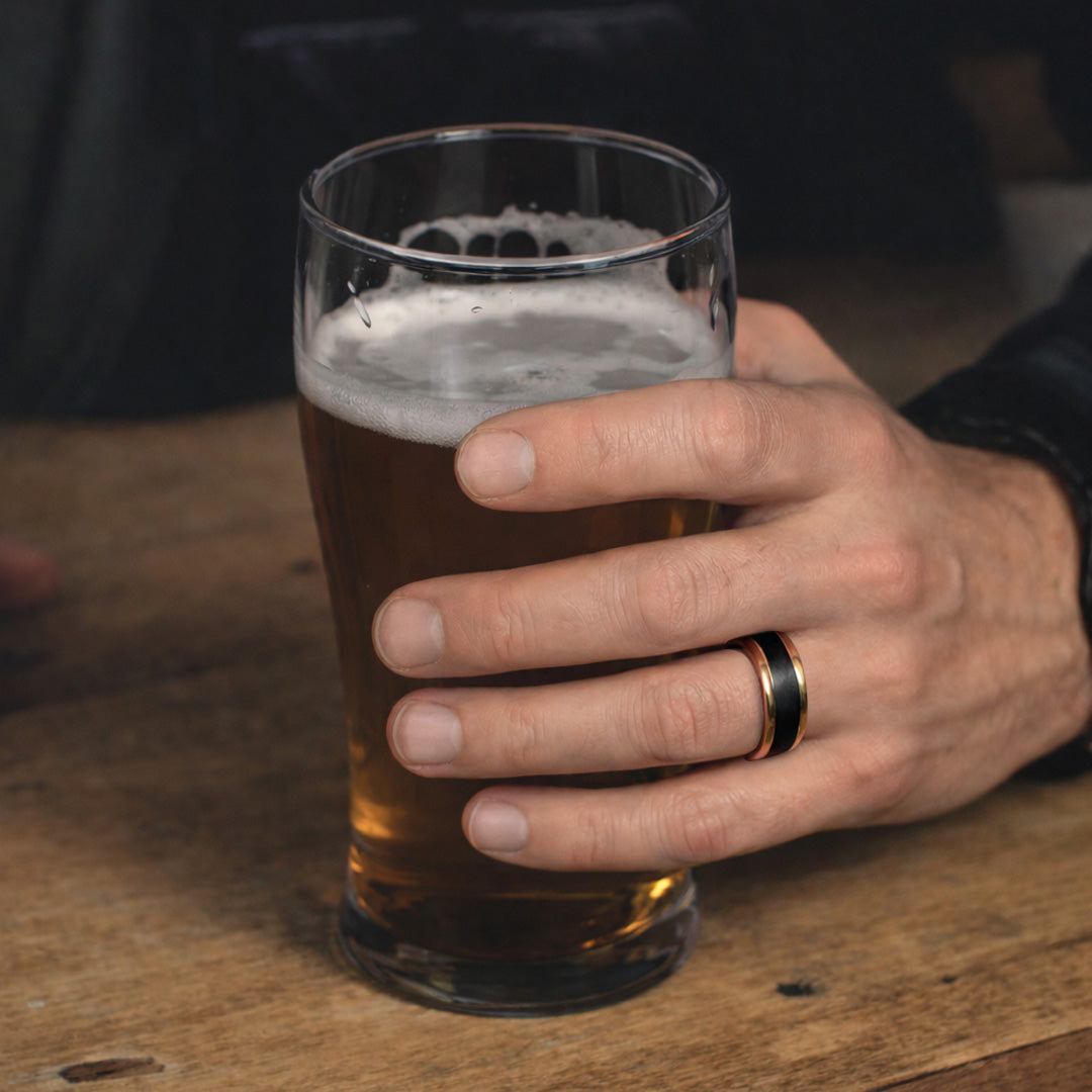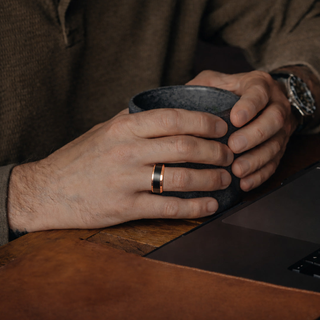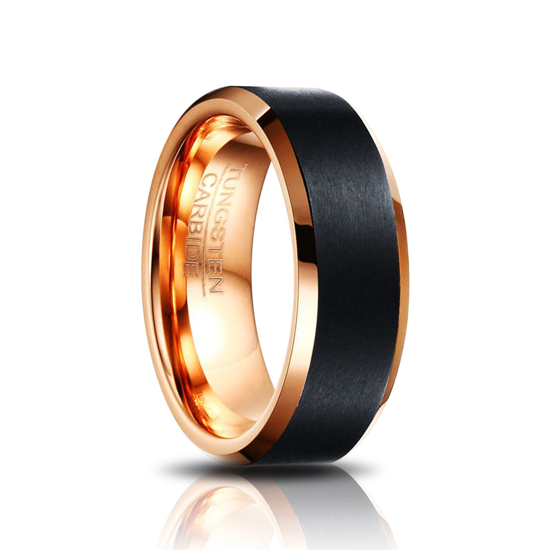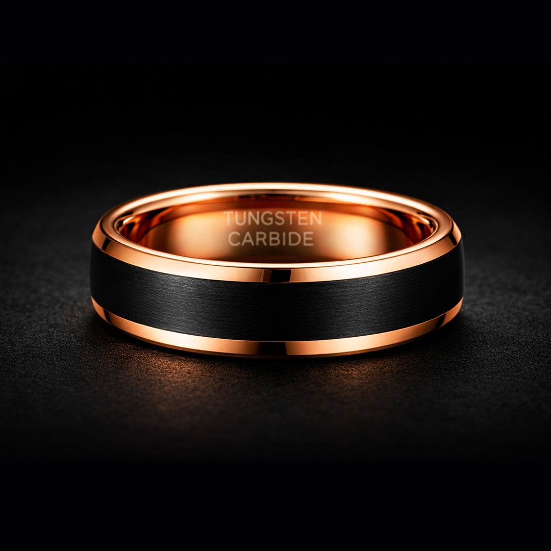 Crafted from solid tungsten carbide, Apollo pairs a matte black exterior with a polished rose gold interior and edges, creating a striking balance between strength and elegance. Designed to feel substantial, durable, and precise—built for everyday wear without compromise.
