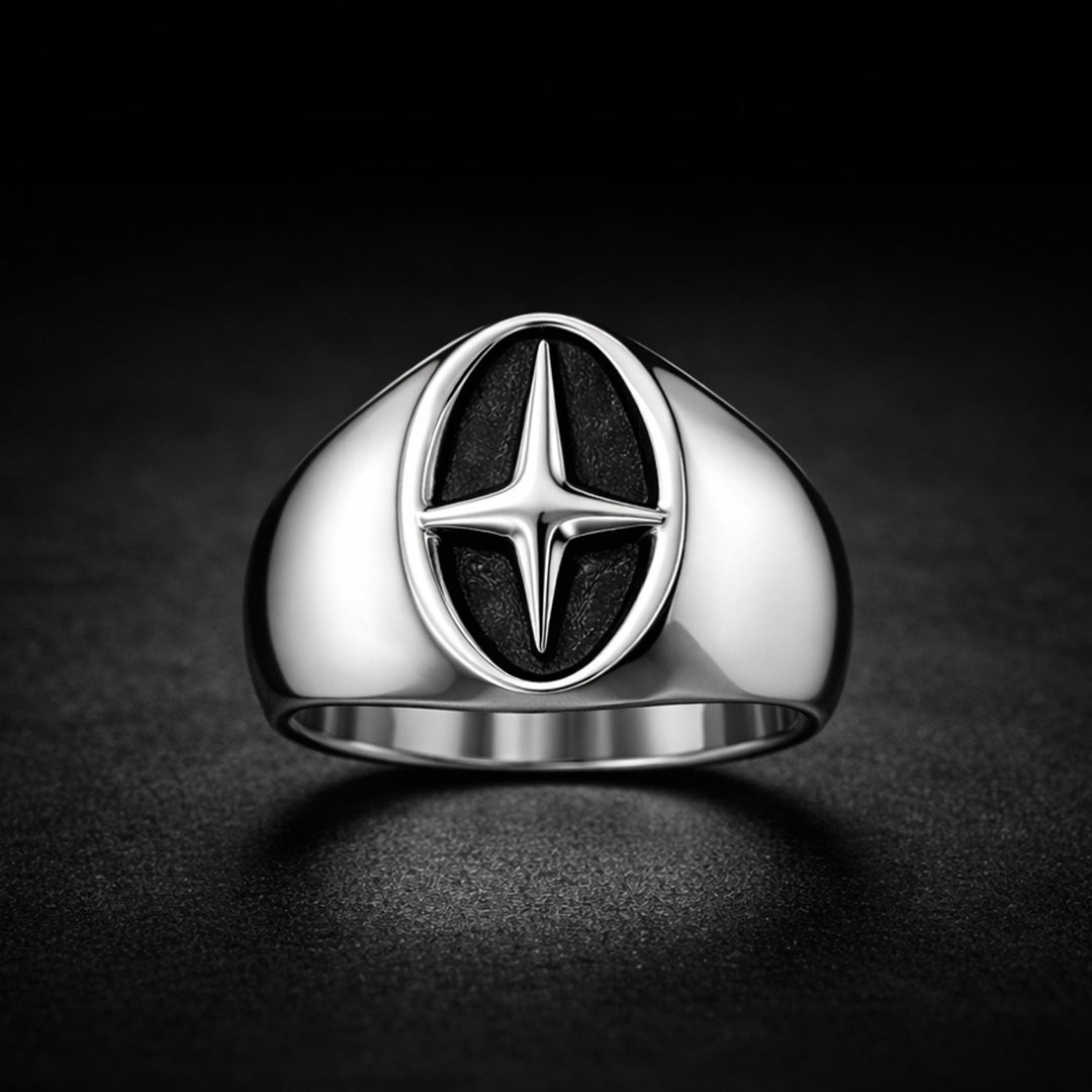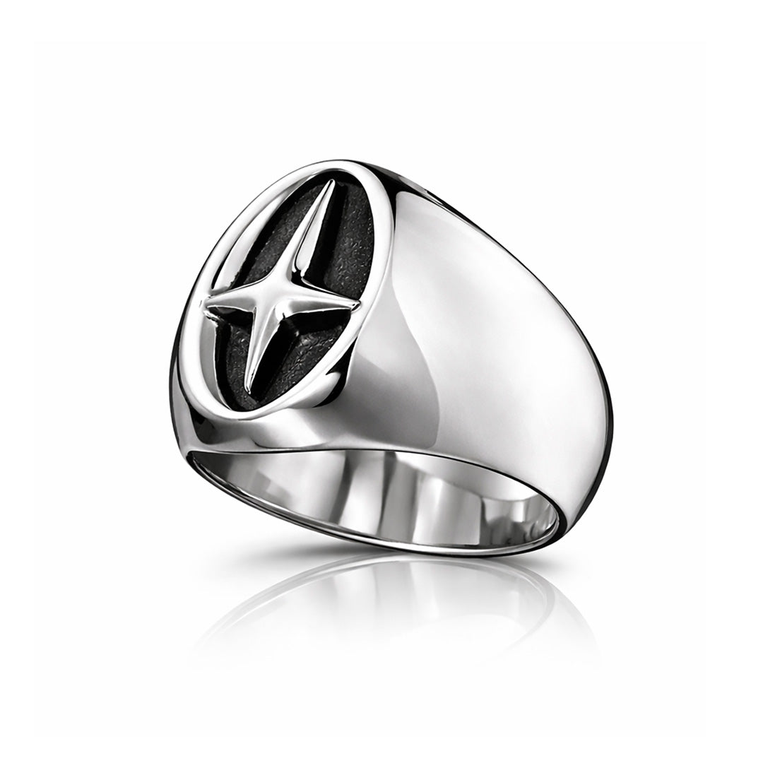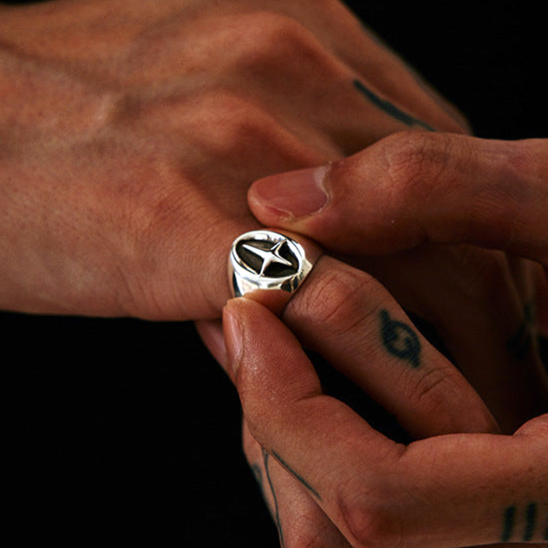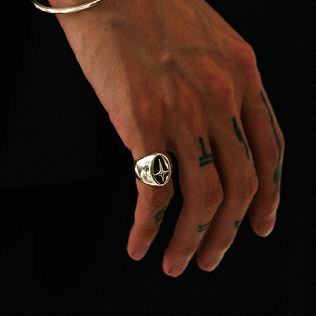 The North Star Signet Ring features a bold geometric emblem set into a polished silver face, inspired by classic compass and navigation symbols. Designed to represent guidance and inner direction, this ring balances timeless signet proportions with a modern, minimalist edge.